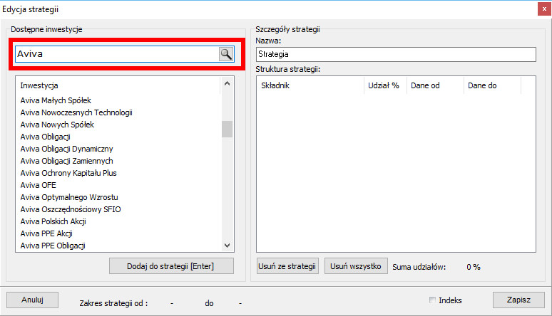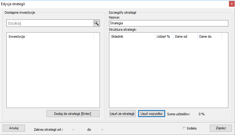 Należy pamiętać, że suma udziałów poszczególnych inwestycji w strategii musi być równa 100%